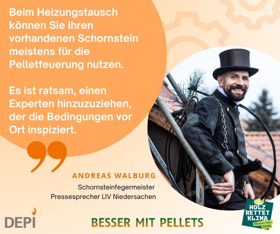 Berlin, 13.12.2023 • Schwindelerregende Höhen machen ihm nichts aus: Schornsteinfegermeister und Pressesprecher des LIV Niedersachsen Andreas Walburg. Der Sicherheits-, Umwelt- und Energie-Experte aus Haselünne in Niedersachsen ist von Pelletheizungen absolut überzeugt. Er verrät, welche Vorteile das Heizen mit Holz bringt und worauf es bei der Wartung von Pelletheizungen ankommt.