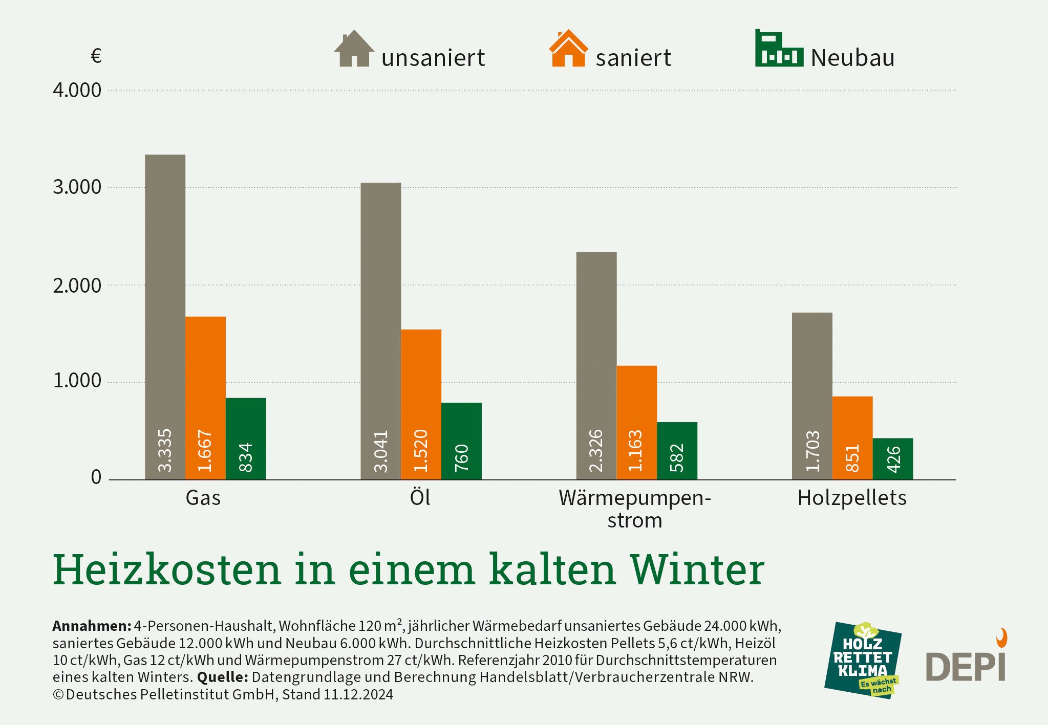 Heizkosten in einem kalten Winter (nach Brennstoff)