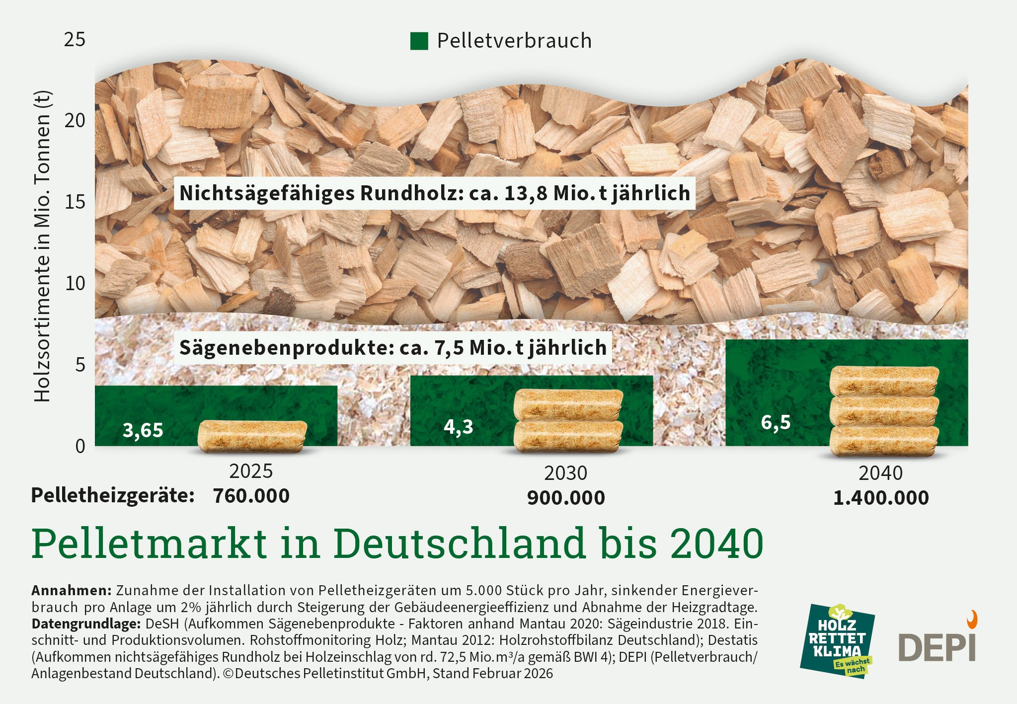 Nichtsägefähiges Rundholz und Sägenebenprodukte sind in Deutschland reichlich vorhanden — Tendenz steigend. Hierzulande heizen aktuell bereits 760.000 Haushalte mit Pellets. Bis 2040 könnte sich diese Zahl beinahe verdoppeln.