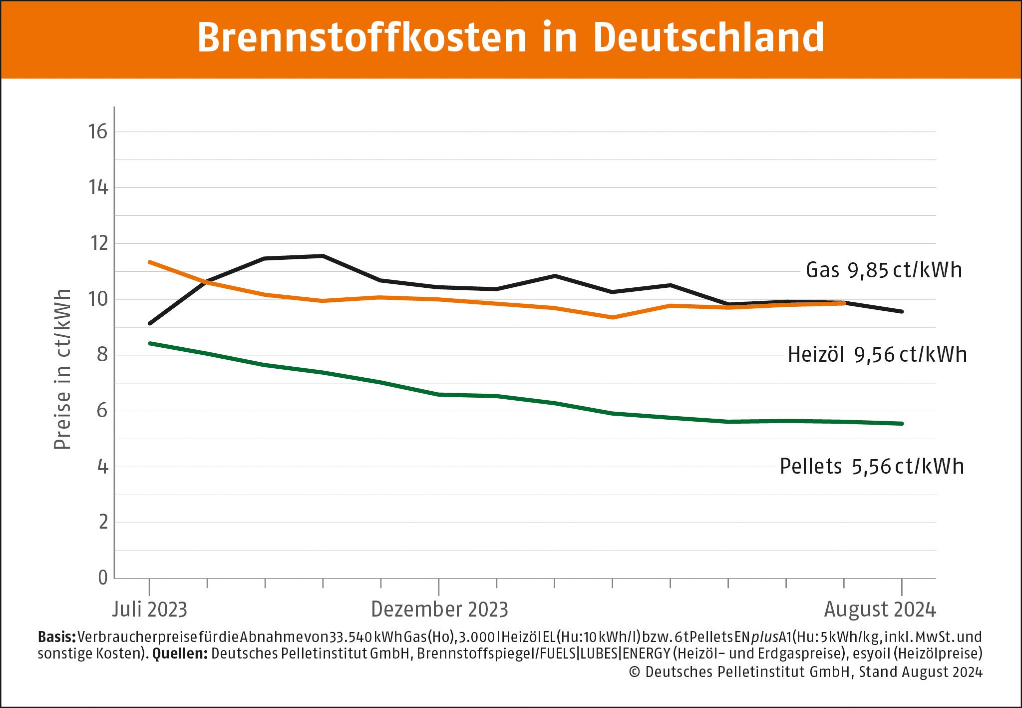 Berlin, 16.08.2024 • Wie in den letzten Sommermonaten, bleibt der Pelletpreis auch im August niedrig. Eine Tonne Holzpellets kostet durchschnittlich 277,92 Euro. Laut dem Deutschen Pelletinstitut ist der Preis seit dem Vormonat um 1,1 Prozent gesunken. Pelletheizer zahlen derzeit 5,56 Cent pro Kilowattstunde klimafreundlicher Wärme. Die Preisersparnis gegenüber Erdgas liegt bei rund 44 Prozent, rd. 42 Prozent sind es gegenüber Heizöl.