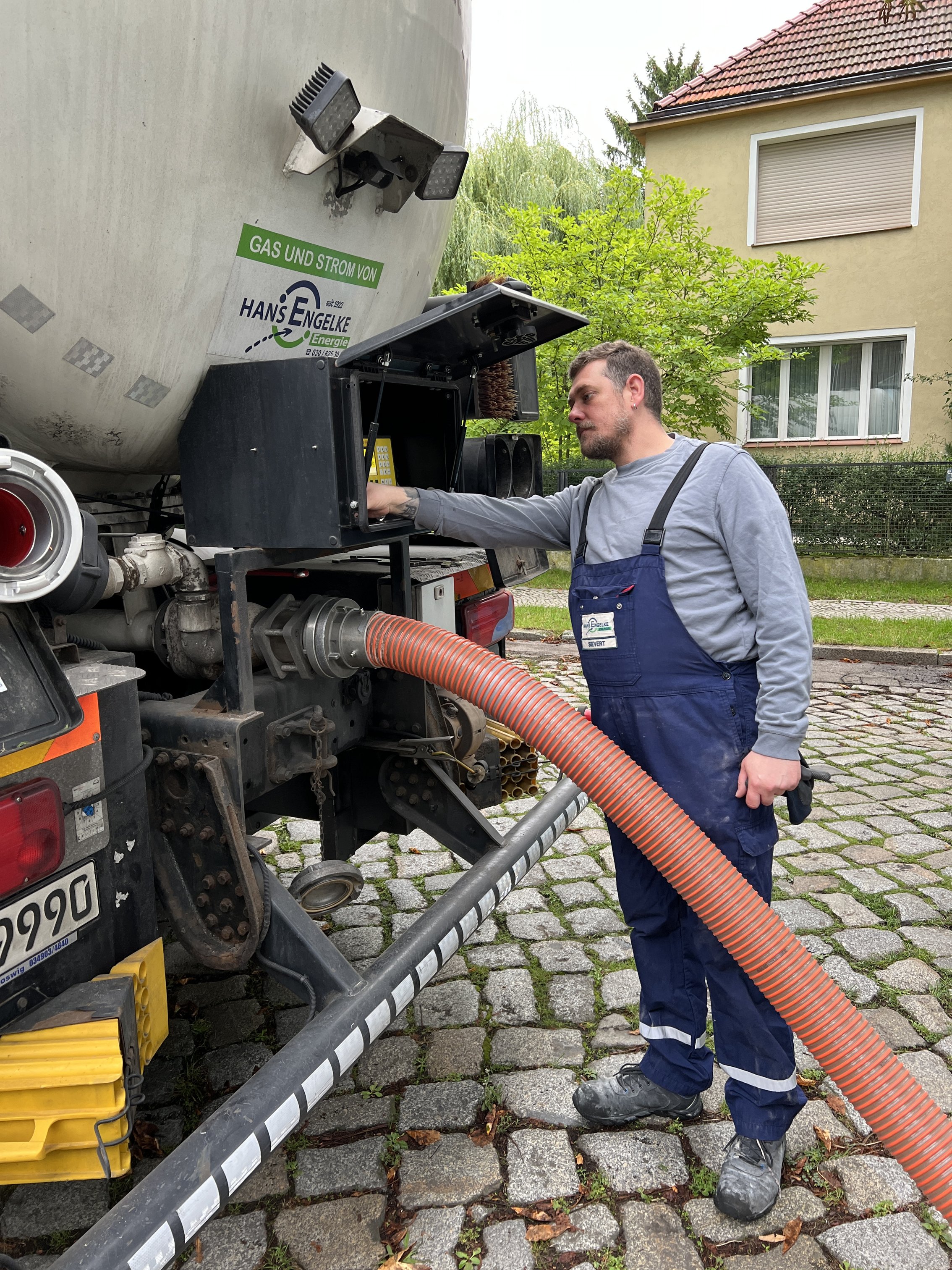 Dann lädt Sievert das Equipment aus. Dazu gehören ein Absauggebläse inklusive Staubsack, eine Kabeltrommel und zwei dicke orangene Schläuche. Am Spritzschutz des Hauses befinden sich zwei Stutzen, die ins Innere des Pelletlagers führen. Die Bedingungen sind optimal: Die Stutzen sind Richtung Straße ausgerichtet, sodass nur eine kurze Strecke mit den Schläuchen überwunden werden muss. Der Fahrer schraubt die Lüftungsdeckel mit einem Spezialwerkzeug auf und bringt die Schläuche an. Durch einen der beiden Zugänge werden die Pellets über den Schlauch ins Lager eingeblasen, durch den anderen der Staub abgesaugt. Sievert ermittelt die benötigte Menge an Pellets: „Man schätzt die Restmenge im Lager und berechnet danach das Volumen“. Er stellt den richtigen Luftdruck am Display ein und startet den Einblasvorgang. Dann fängt es an zu summen und zu brummen. Etwa vier Tonnen Pellets werden auf diesem Weg in das Lager gebracht. „Man muss danebenstehen und es sich anschauen. Man entwickelt als Fahrer ein Gefühl dafür, wann das Lager voll ist“, erklärt Sievert. Die Kundin bringt ihm eine Tasse Kaffee nach draußen, um die kurze Wartezeit zu überbrücken. Schließlich beendet der Fahrer den Einblasvorgang, löst die Schläuche von den Stutzen und lädt sie wieder ins Fahrzeug ein.
