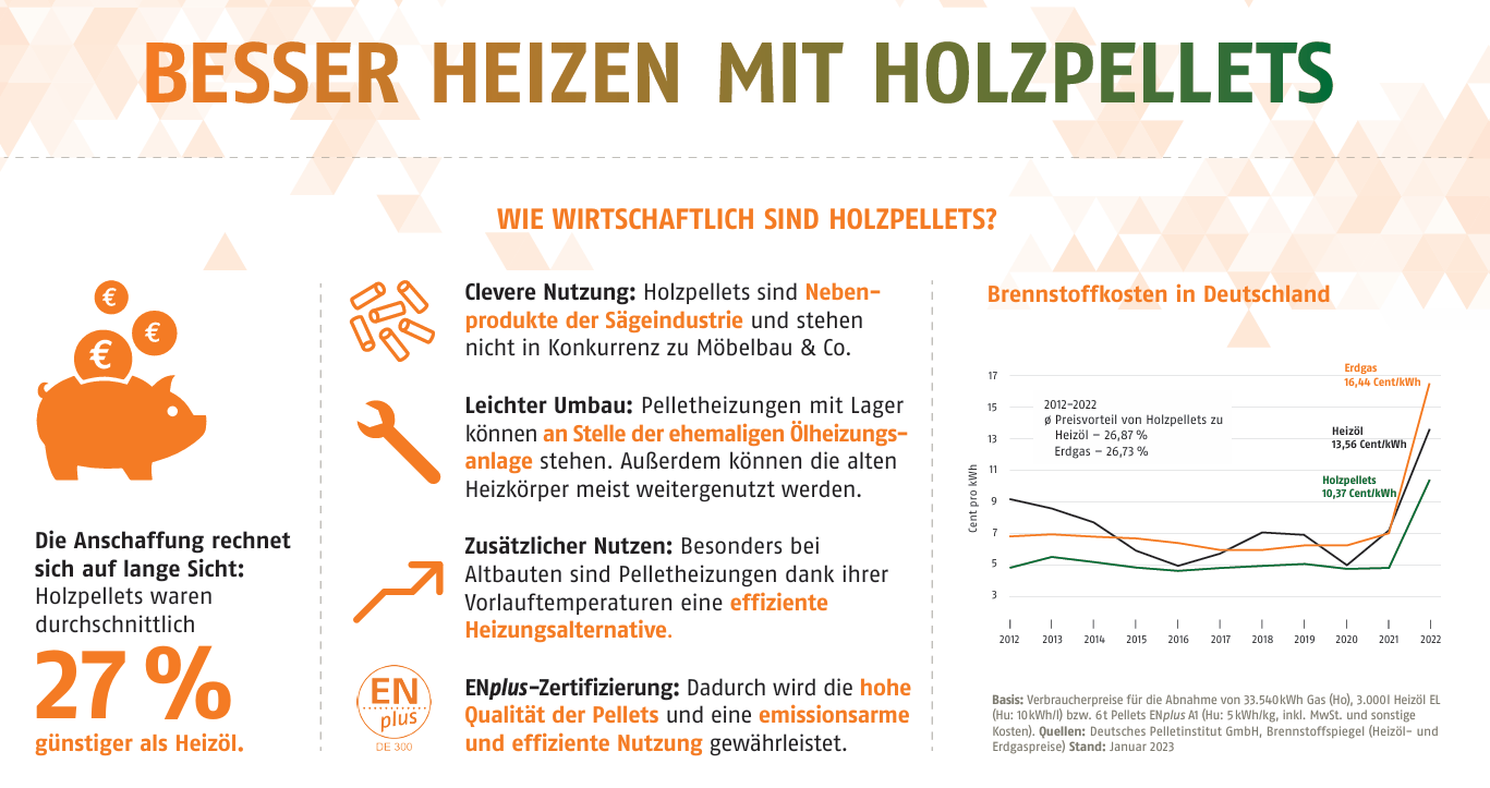 Das A3-Poster „Besser Heizen mit Holzpellets“ verdeutlicht die drei übergeordneten Vorteile von Pellets: Sie sind wirtschaftlich, klimafreundlich und machen Deutschland bei der Wärme unabhängig von fossilen Brennstoffen. Mit aktuellen Zahlen und Fakten sowie anschaulichen Grafiken unterlegt, eignet sich das Poster zur Ausstellung im Firmensitz, bei Messen oder zur Kundenwerbung.