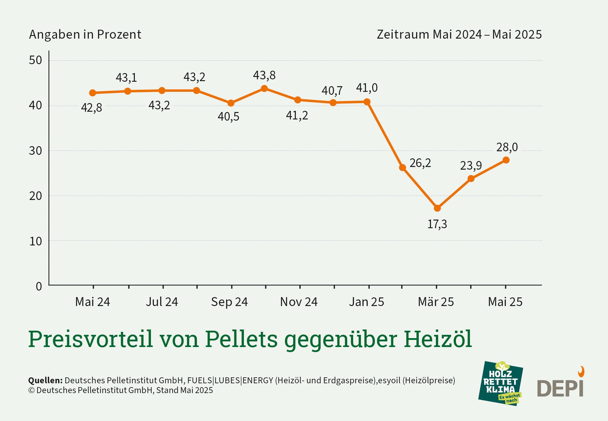 Preisvorteil Pellets gegenüber Heizöl - Mai 2025