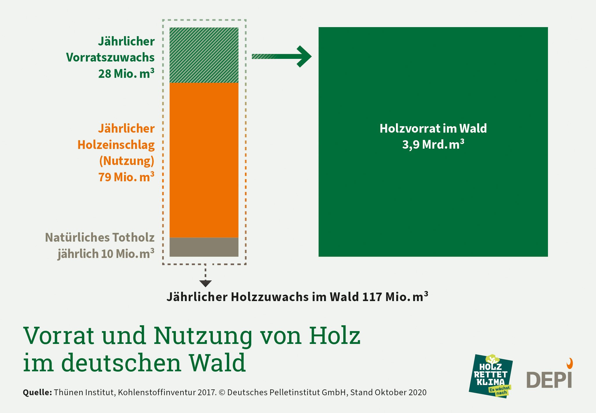 Seit dem 2. Weltkrieg nahm die Waldfläche in Deutschland bereits um rd. 1,5 Mio. Hektar (ha) zu. So wuchs die Waldfläche z.B. von 2002 bis 2012 jährlich um 5.000 ha (7.000 Fußballfelder). Auch der Holzvorrat nimmt in Deutschland seit Jahrzehnten zu. Allein von 2012 bis 2017 wuchs er um 5 Prozent auf insgesamt 3,9 Mrd. m³ bzw. von 338 auf 348 m³/ha: In Deutschlands Wäldern wachsen jedes Jahr 10,9 m3 Holz/ha. Das sind insgesamt 117 Mio. m³ Holz. Nur 66 Prozent dieser Holzmenge (77,3 Mio. m³) wird für die Holznutzung eingeschlagen (Einschlag in Vorratsfestmetern, d. h. Nutzholz inkl. Rinde und Ernteverluste). 10 Prozent dieser Holzmenge fällt als Totholz an (11,7 Mio. m³) und 24 Prozent dieser Menge – das sind 28,1 Mio. m³ – erhöhen jedes Jahr den Holzvorrat (Zahlen jeweils bezogen auf die gesamte Waldfläche).