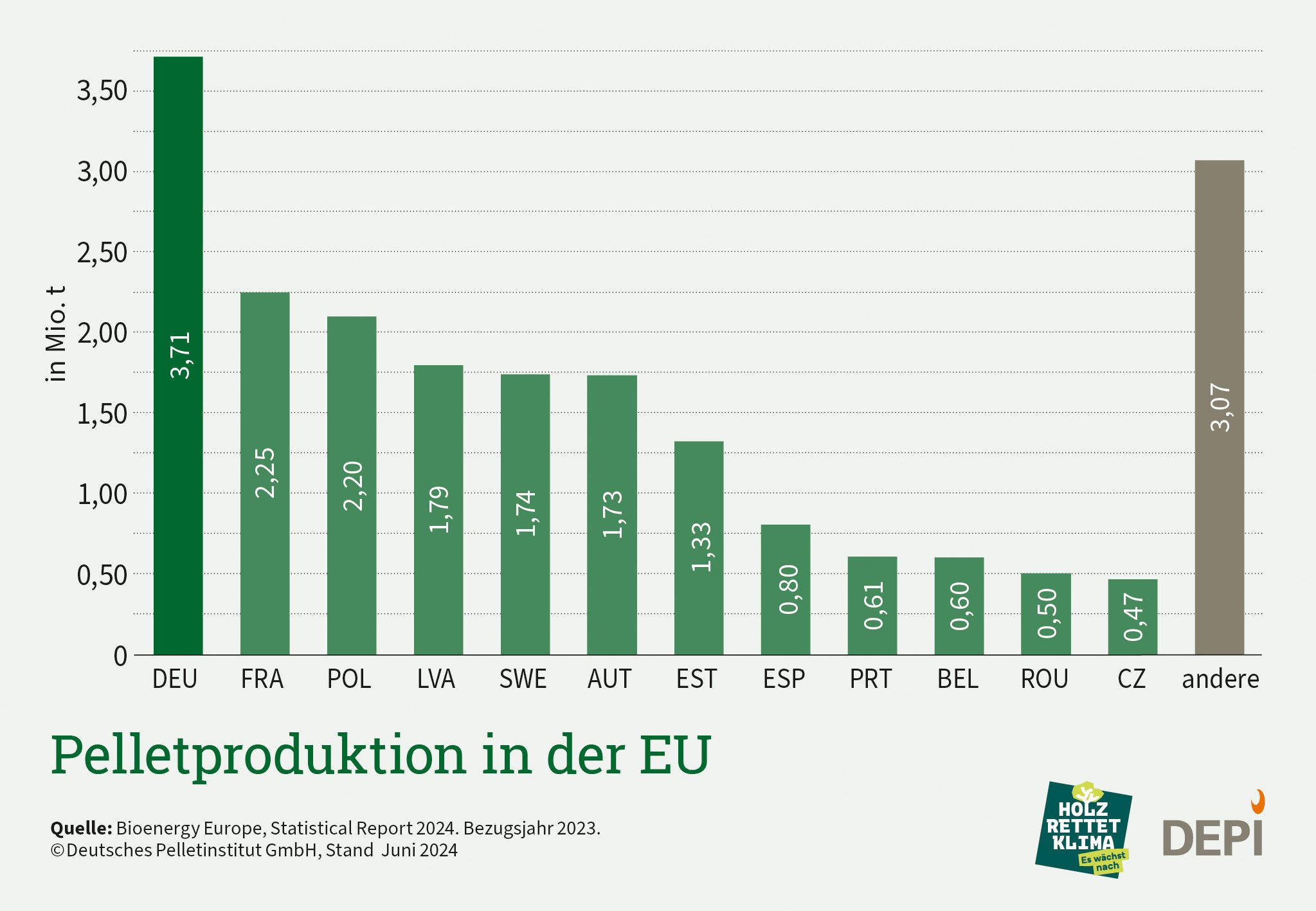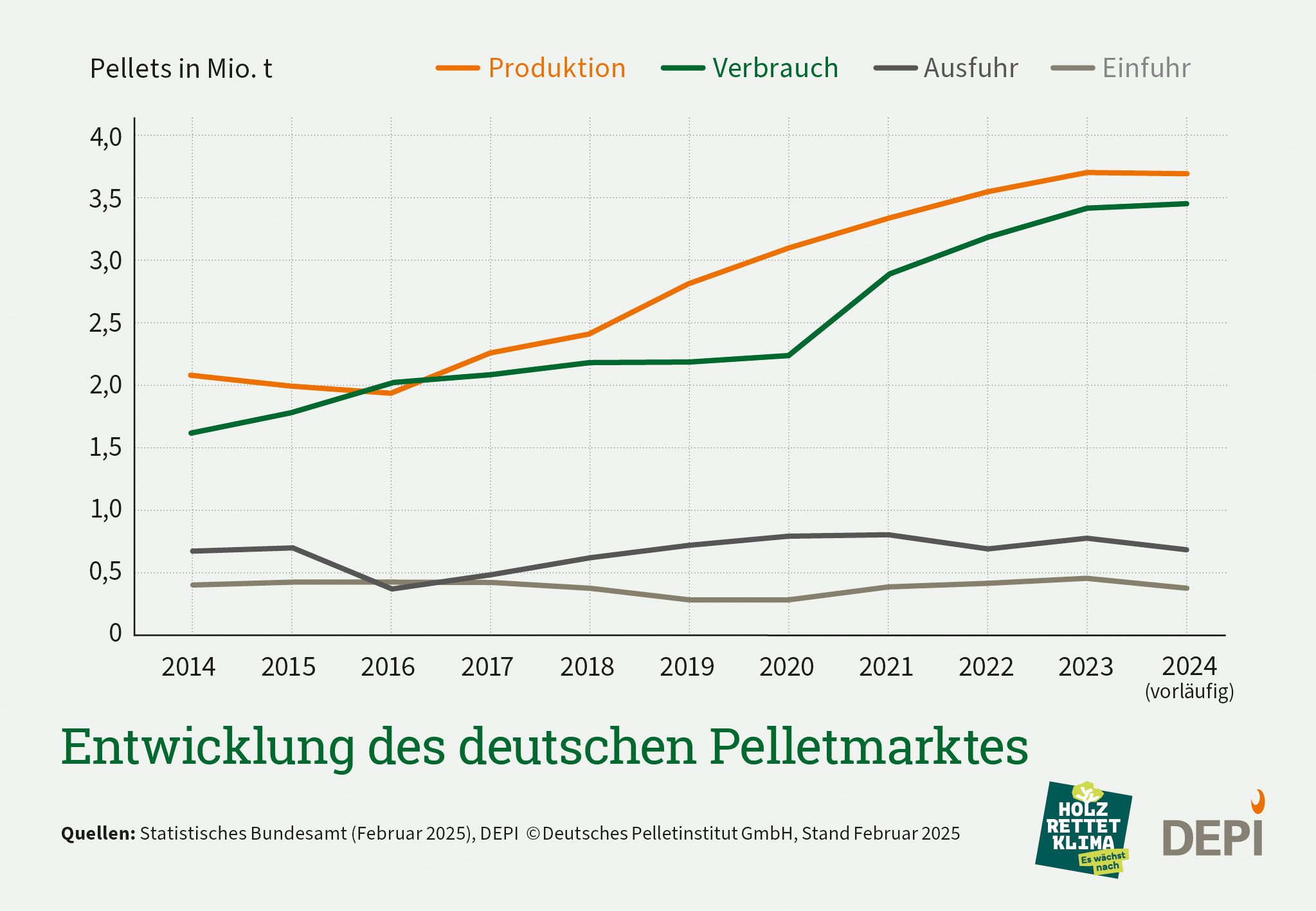 Aufgrund seines hohen Holzreichtums und des weiter zunehmenden Holzvorrates kann sich Deutschland selbst mit Pellets versorgen. Pellets werden in Deutschland zu 95 Prozent aus Sägenebenprodukten erzeugt, die in Sägewerken bei der Produktion von Schnittholz anfallen. Deutschland erzielt jährlich einen Exportüberschuss von mehreren hunderttausend Tonnen. 2016 führte die Insolvenz des größten deutschen Pelletproduzenten zur vorübergehenden Stilllegung mehrerer Pelletwerke und einer Halbierung des Pelletexports, so dass es 2016 erstmals mehr Einfuhren als Ausfuhren gab – allerdings ohne dass die Menge an Pelletimporten angestiegen wäre. Ab 2017 war die Pelletaußenhandelsbilanz bereits wieder positiv.