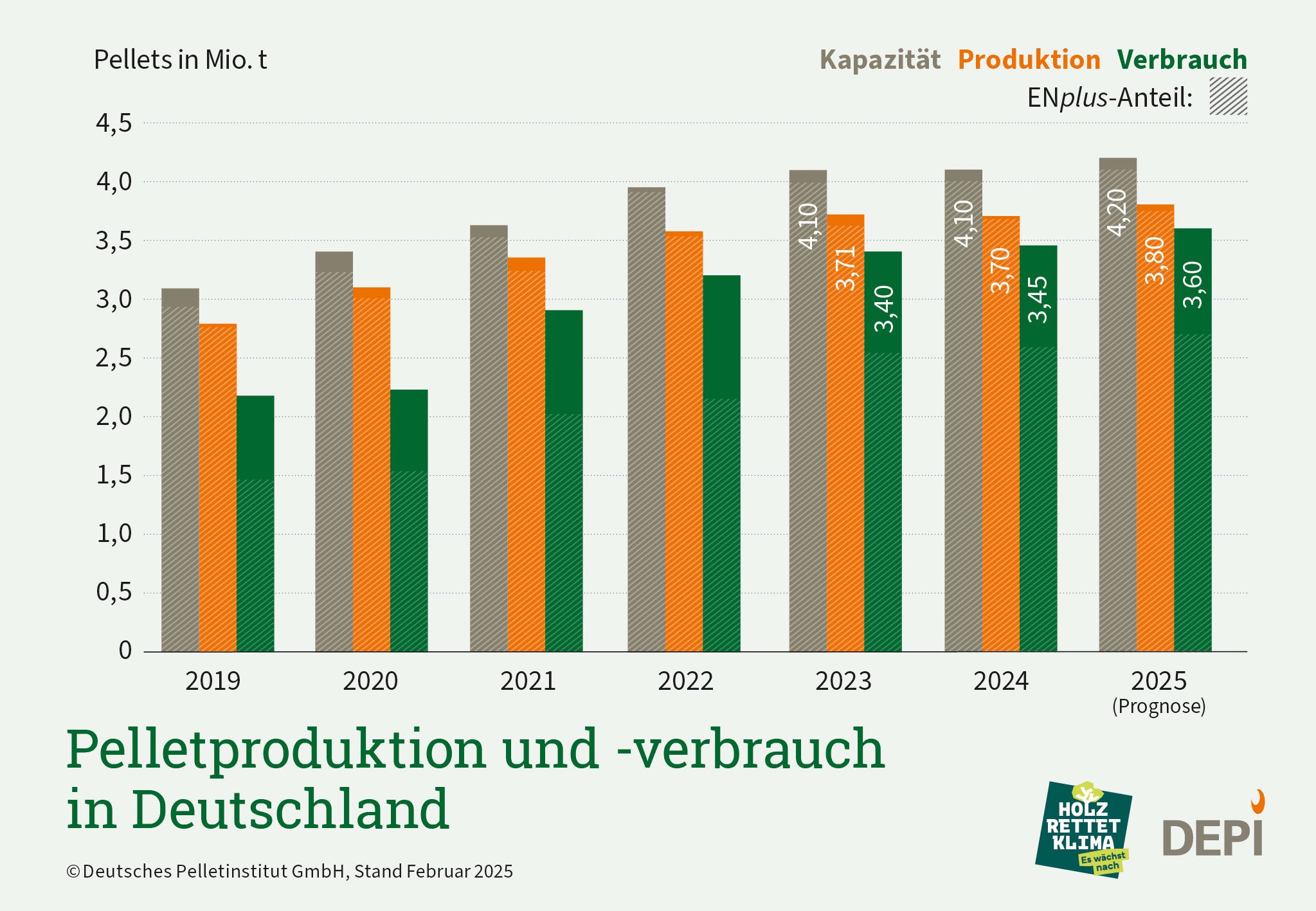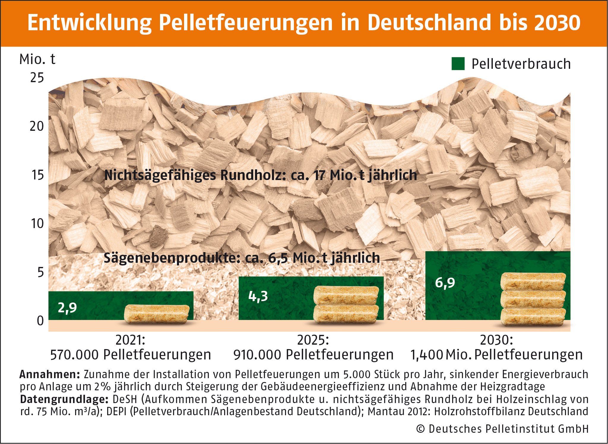 Deutschland hat ein großes Holzaufkommen und eine hohe Sägewerksdichte und damit eine breite Rohstoffbasis zur Herstellung von Pellets. Das ermöglicht eine zunehmende Nutzung. Bisher verbrauchen Pelletfeuerungen in Deutschland rd. 3 Mio. t Pellets pro Jahr. Das sind weniger als 15 Prozent des heimischen Gesamtaufkommens an Sägenebenprodukten und Industrieholz. In Zukunft wird aber auch der Import zertifizierter, aus nachhaltigen Resthölzern hergestellter Pellets eine größere Rolle spielen.
