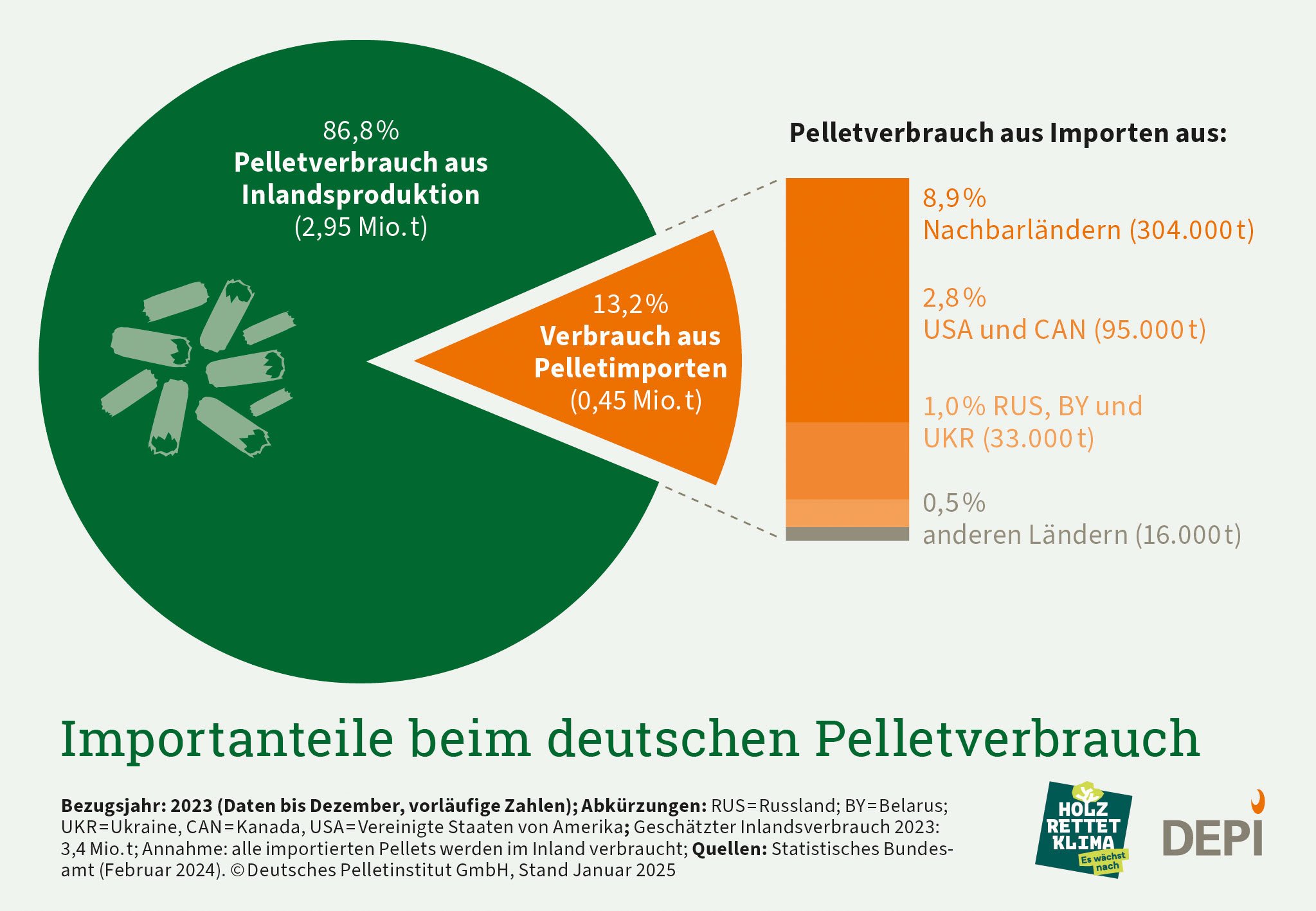Die in Deutschland verbrauchten Pellets stammen zum überwiegenden Teil aus Deutschland und aus seinen Nachbarländern. Pelletimporte aus Übersee spielen nur eine geringe Rolle. Gleichzeitig werden mehr Pellets aus Deutschland exportiert als importiert.