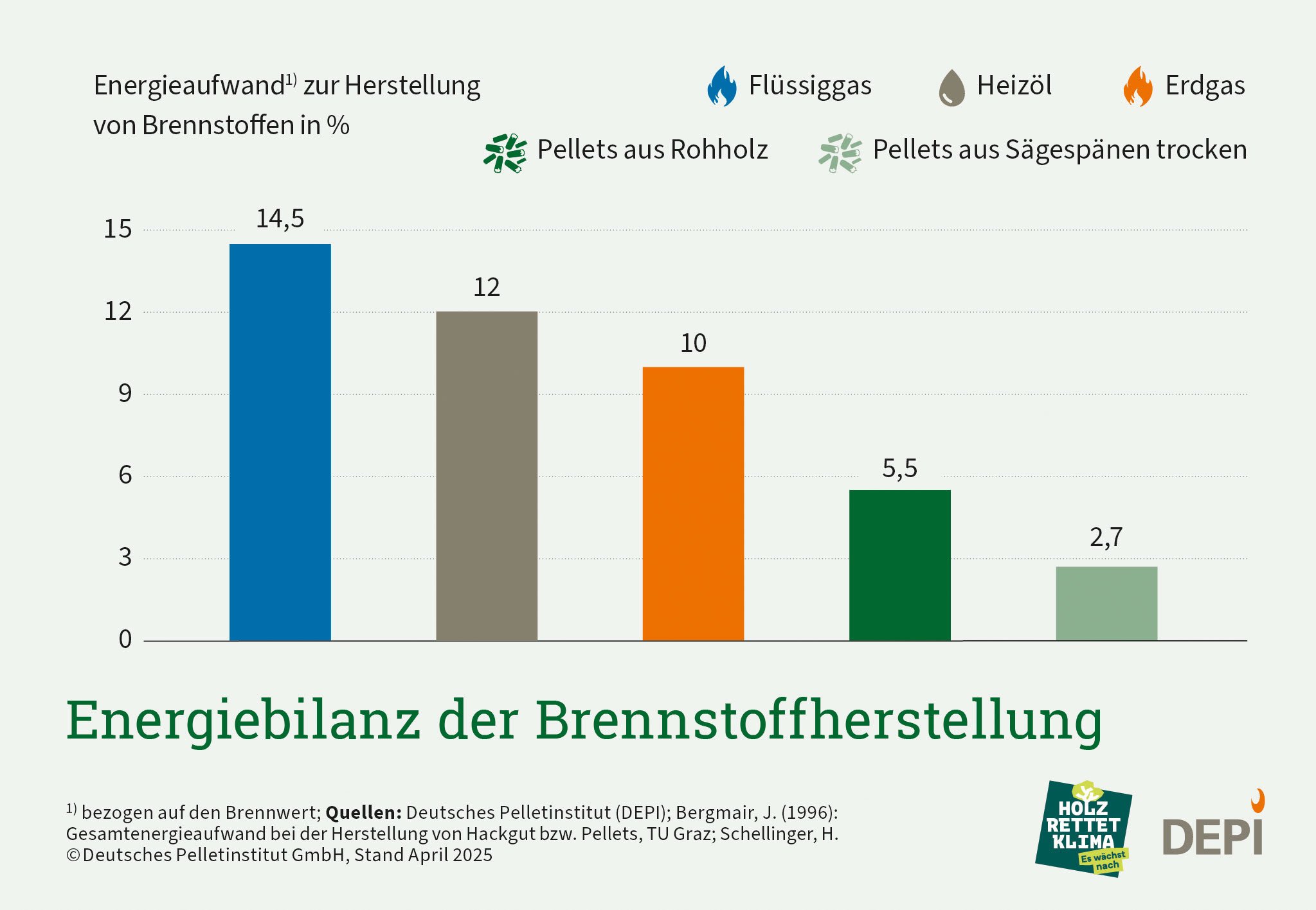 Bereits bei der Produktion von Holzpellets achten die Hersteller darauf, möglichst wenig Energie einzusetzen. So liegt der Energieaufwand für die Herstellung von Pellets bei nur 2,7 Prozent. Dieser Aufwand ist im Vergleich zu anderen Brennstoffen wie Erdgas (zehn Prozent) und Heizöl (zwölf Prozent) sehr gering.