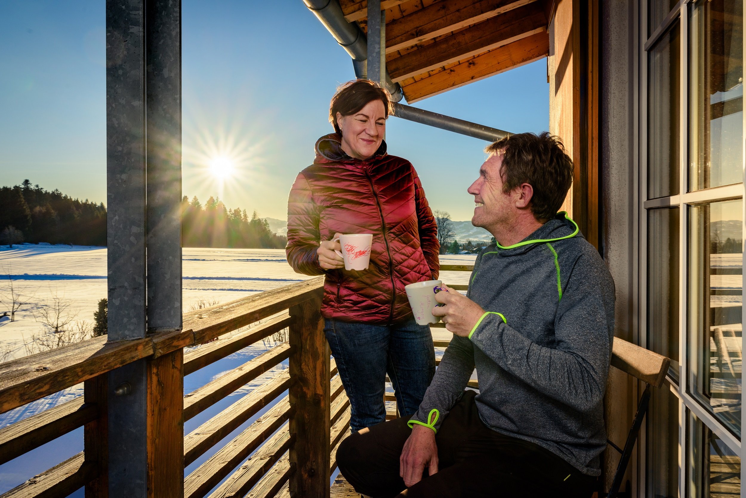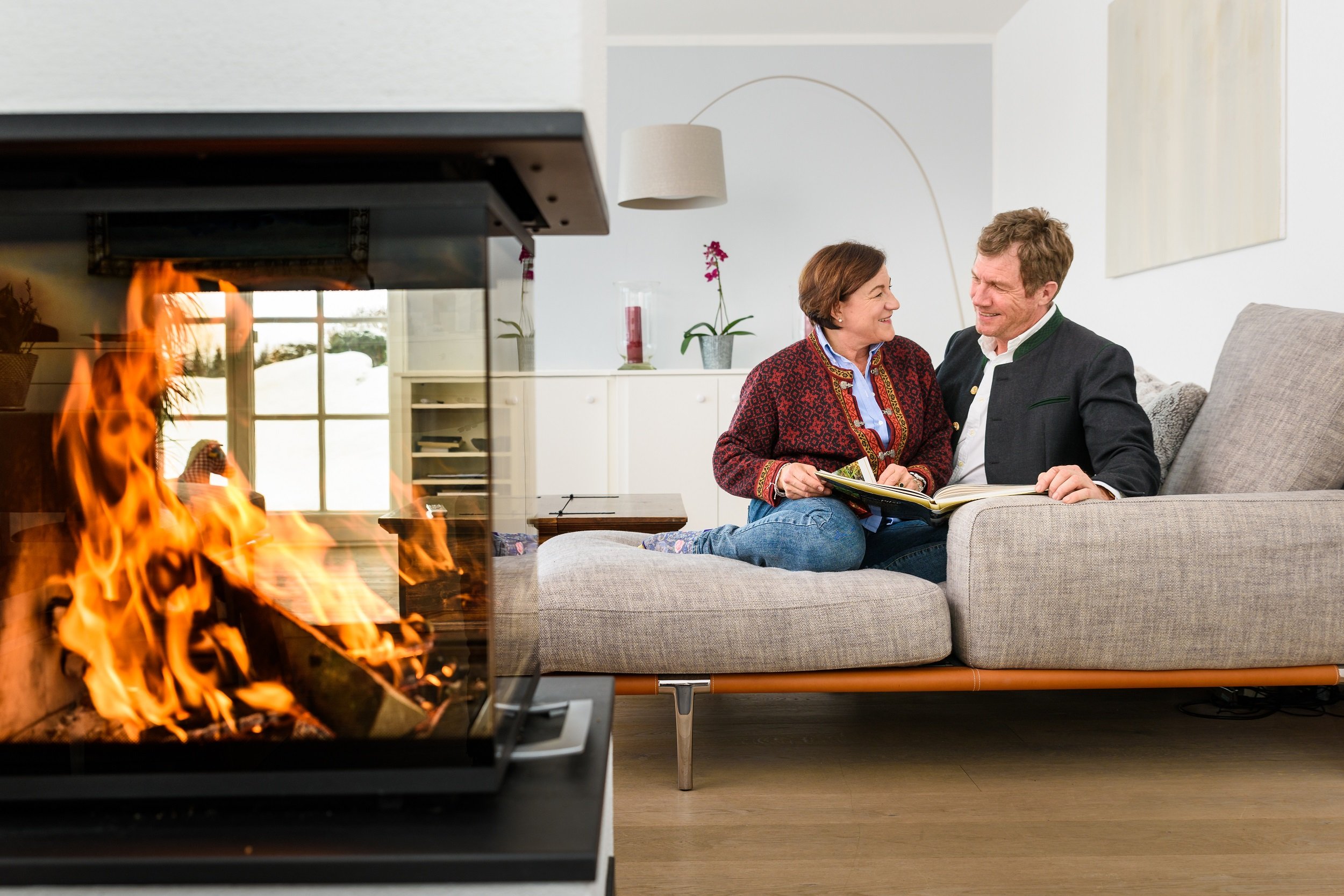 Großzügige 300 Quadratmeter ist das zweistöckige Wohnhaus groß. Es liegt sanft am Hang mit Blick auf den Rottachsee und den Gipfel des Grünten, auch „Wächter des Allgäus“ genannt. Die Skilanglaufspur beginnt direkt am Gartenzaun, was die sportbegeisterten Madleners im Winter fast täglich nutzen. „Wenn ich von der Loipe heimkomme, freue ich mich auf unser Zuhause. Dank Pelletheizung ist es überall angenehm warm. Zusätzliche Entspannung bietet unser Holzkamin im Wohnzimmer“, erzählt Beatrix Madlener, die in der Möbelbranche arbeitet.