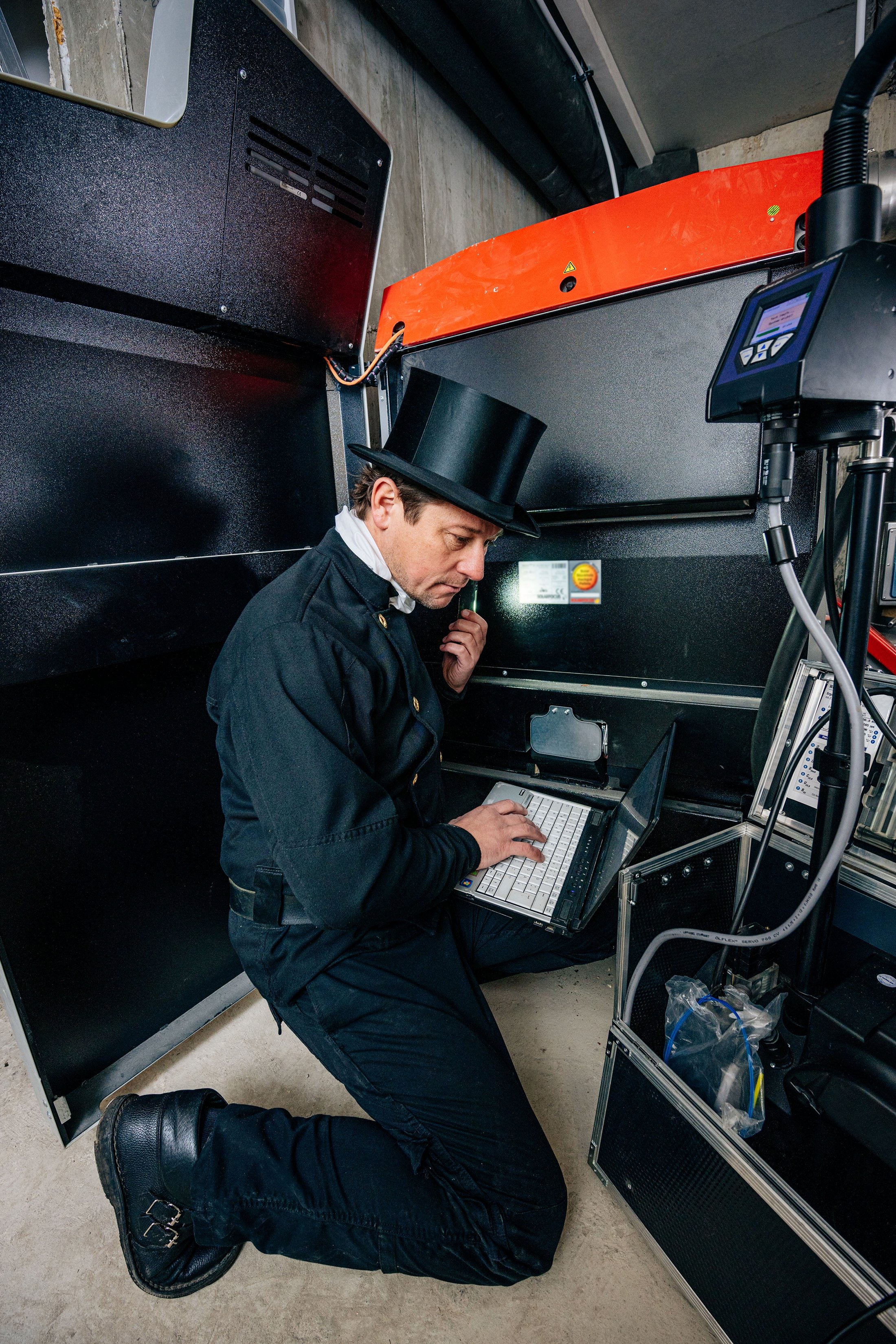 Der Schornsteinfeger führt am Kessel eine Emissionsmessung durch.
