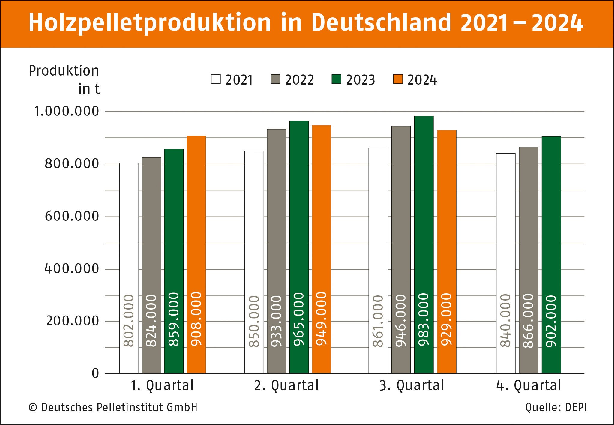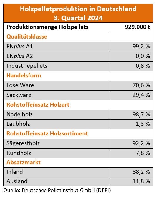 Berlin, 22.10.2024 • Im dritten Quartal 2024 wurden 929.000 Tonnen (t) Holzpellets hergestellt. Damit liegt die Produktionsmenge deutscher Pelletwerke laut Deutschem Pelletinstitut (DEPI) leicht unter dem Vorjahreswert (983.000 t).