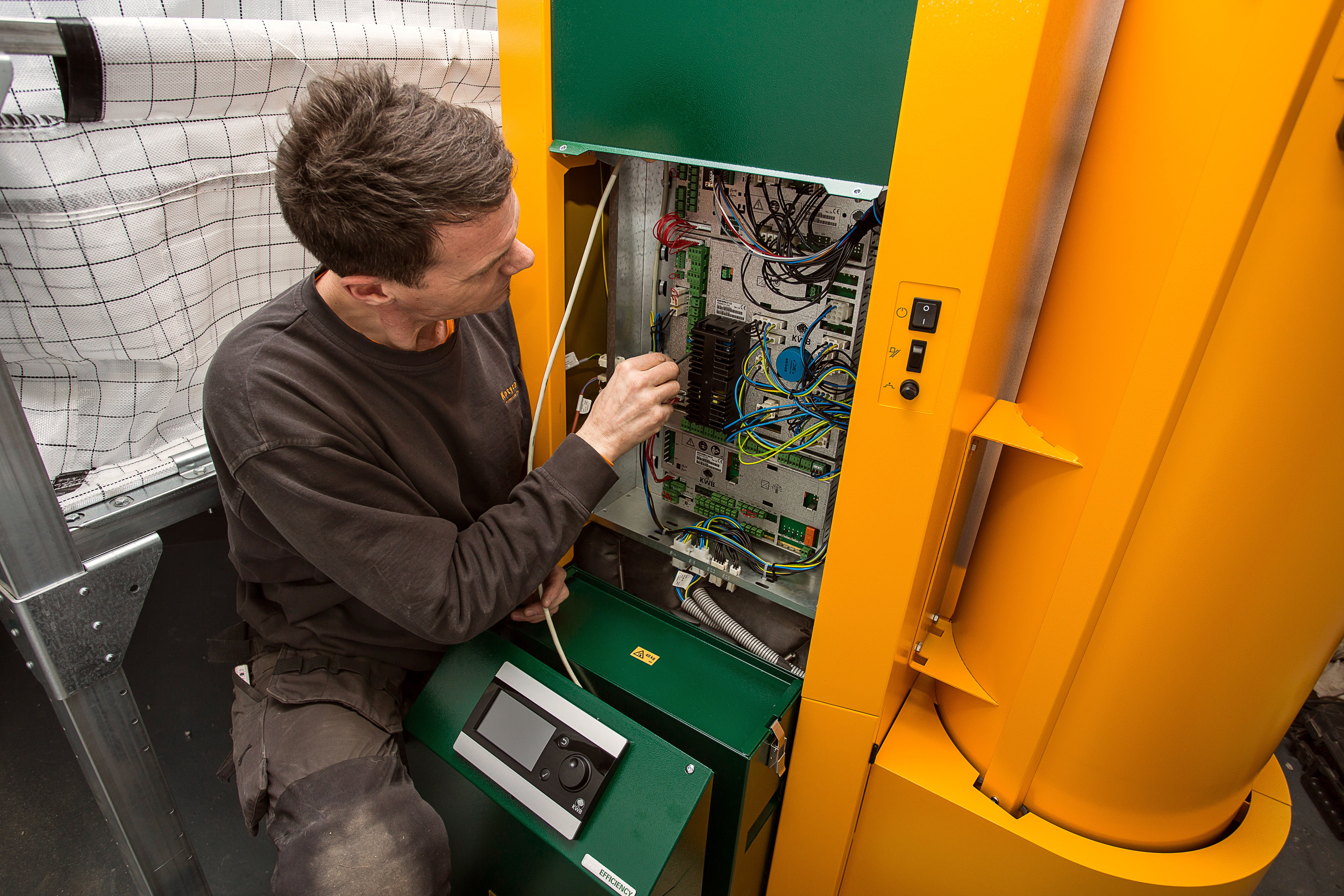 Der Kessel hat seine Verkleidung angezogen, jetzt werden noch die letzten Kabel angeschlossen. Für die Mitarbeiter vom Pelletfachbetrieb Kotyza kein Problem.