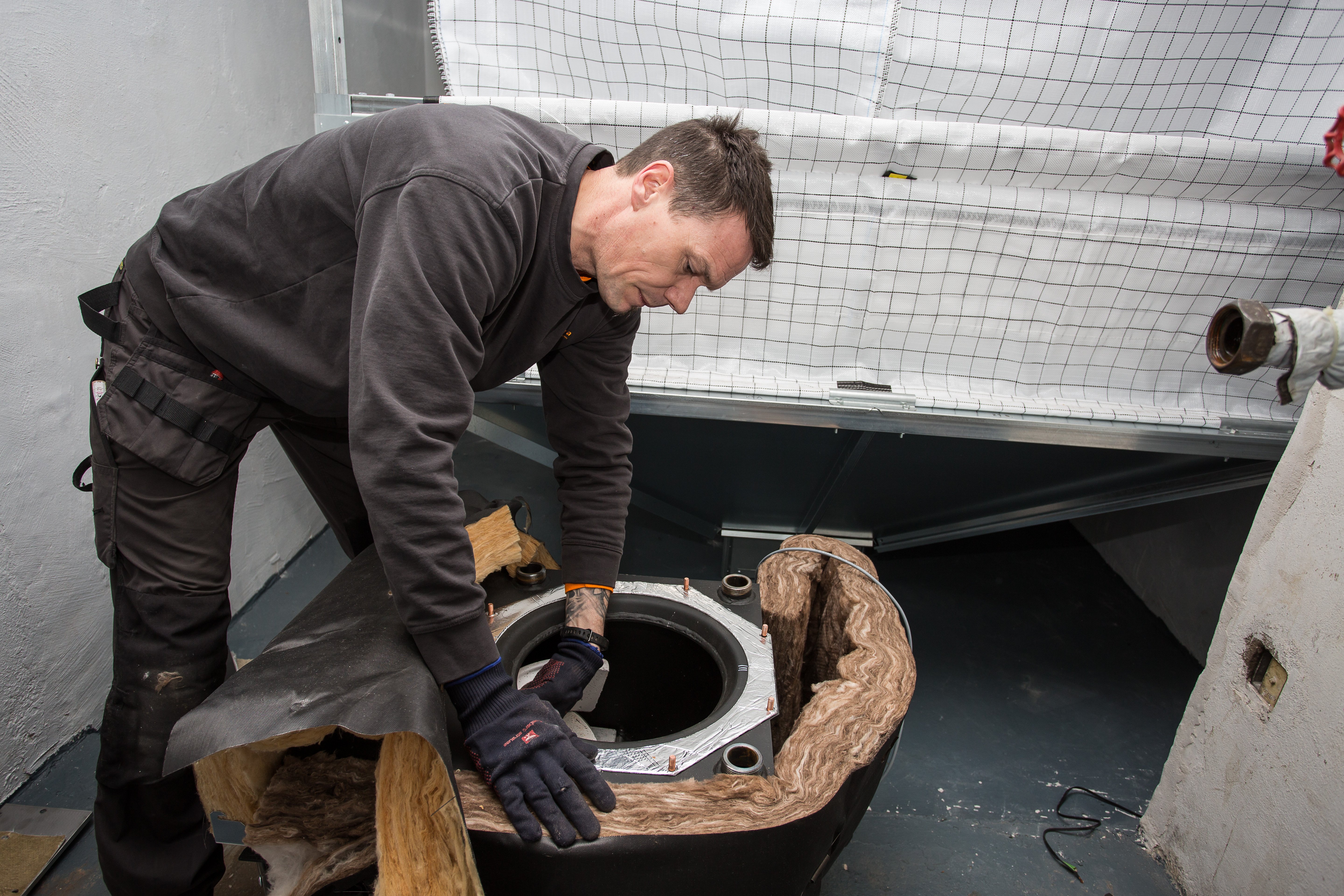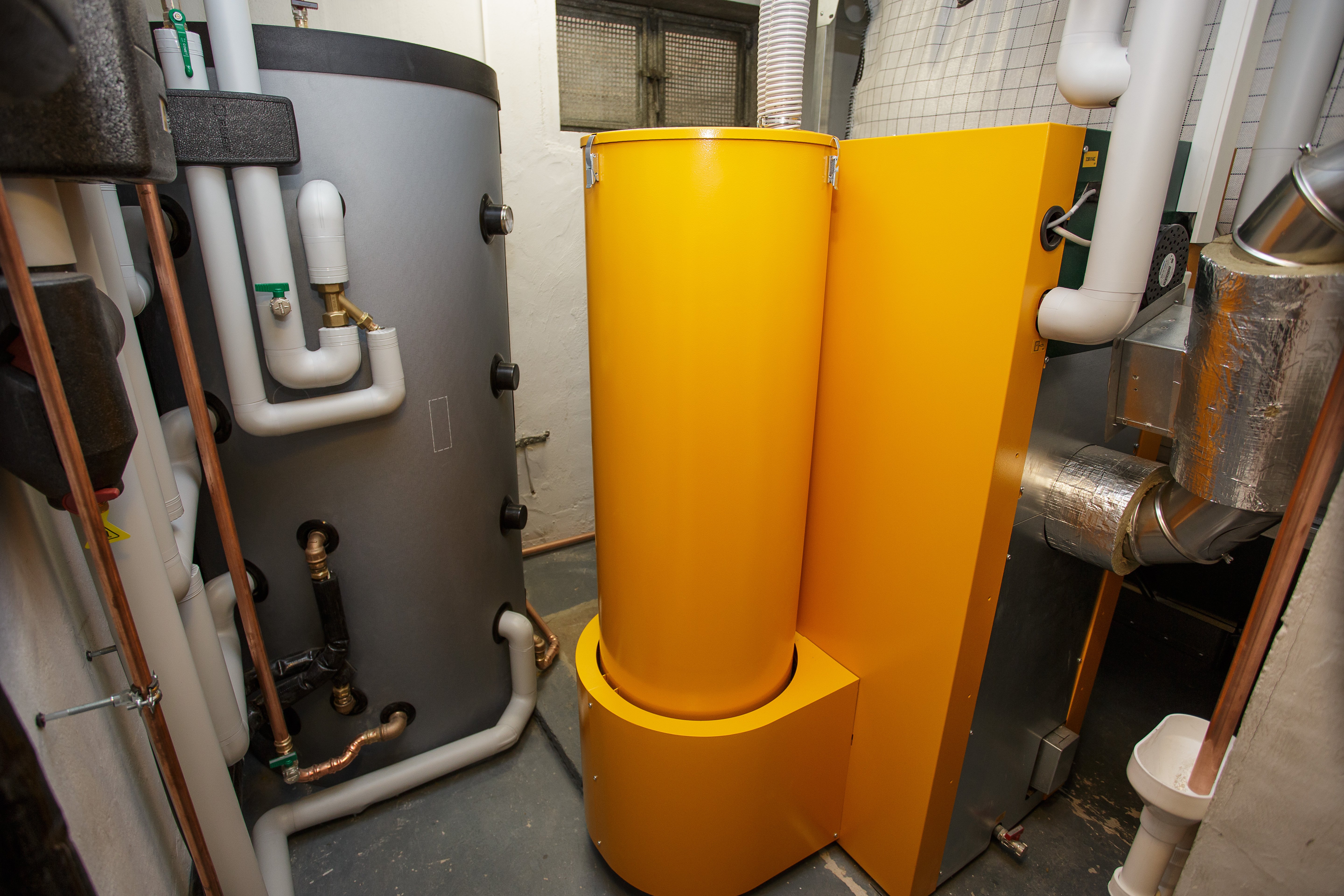 Pufferspeicher, Kessel und Gewebesilo stehen „nackt“ im frisch gestrichenen Keller und warten auf ihre Vereinigung.