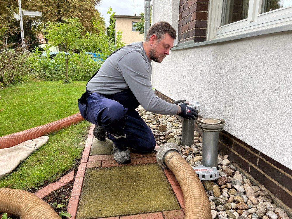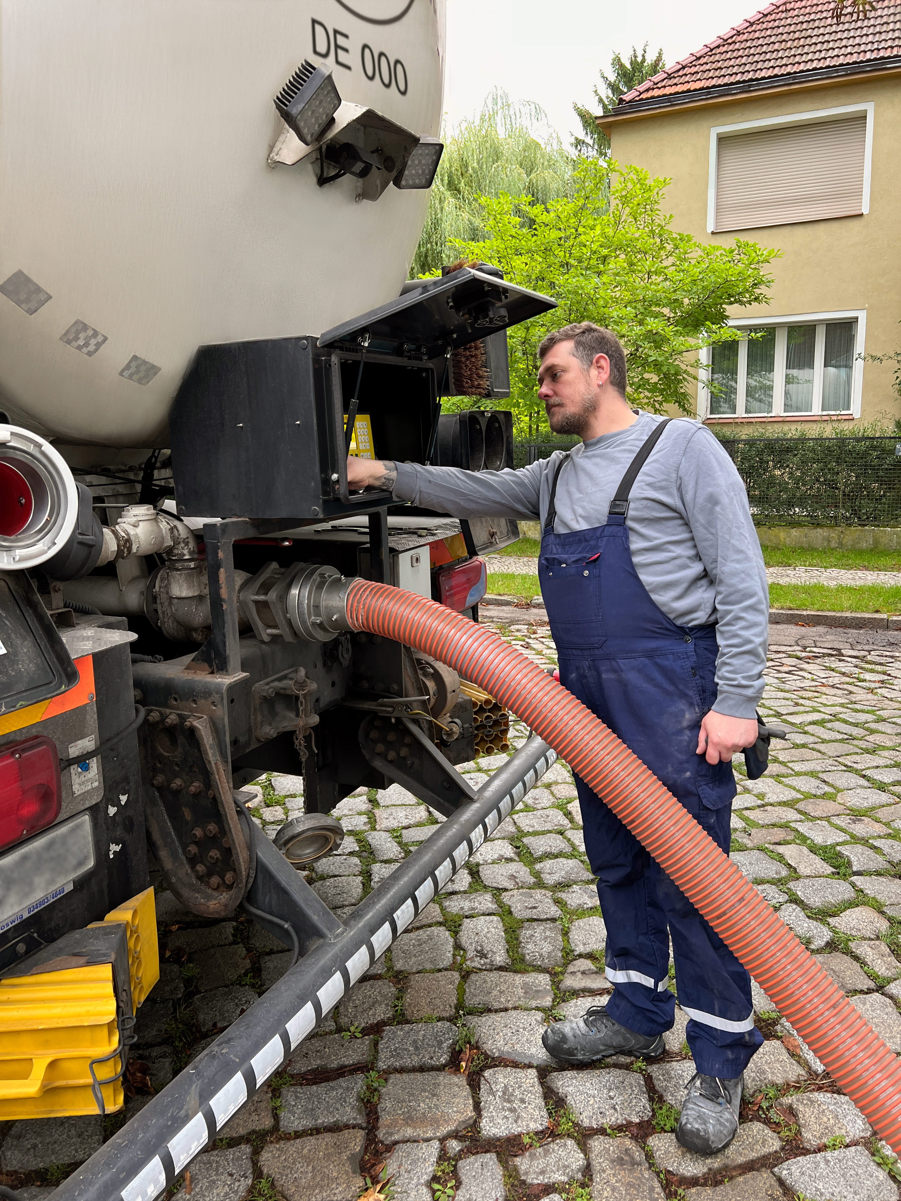 Dann lädt Sievert das Equipment aus. Dazu gehören ein Absauggebläse inklusive Staubsack, eine Kabeltrommel und zwei dicke orangene Schläuche. Am Spritzschutz des Hauses befinden sich zwei Stutzen, die ins Innere des Pelletlagers führen. Die Bedingungen sind optimal: Die Stutzen sind Richtung Straße ausgerichtet, sodass nur eine kurze Strecke mit den Schläuchen überwunden werden muss. Der Fahrer schraubt die Lüftungsdeckel mit einem Spezialwerkzeug auf und bringt die Schläuche an. Durch einen der beiden Zugänge werden die Pellets über den Schlauch ins Lager eingeblasen, durch den anderen der Staub abgesaugt. Sievert ermittelt die benötigte Menge an Pellets: „Man schätzt die Restmenge im Lager und berechnet danach das Volumen“. Er stellt den richtigen Luftdruck am Display ein und startet den Einblasvorgang. Dann fängt es an zu summen und zu brummen. Etwa vier Tonnen Pellets werden auf diesem Weg in das Lager gebracht. „Man muss danebenstehen und es sich anschauen. Man entwickelt als Fahrer ein Gefühl dafür, wann das Lager voll ist“, erklärt Sievert. Die Kundin bringt ihm eine Tasse Kaffee nach draußen, um die kurze Wartezeit zu überbrücken. Schließlich beendet der Fahrer den Einblasvorgang, löst die Schläuche von den Stutzen und lädt sie wieder ins Fahrzeug ein.
