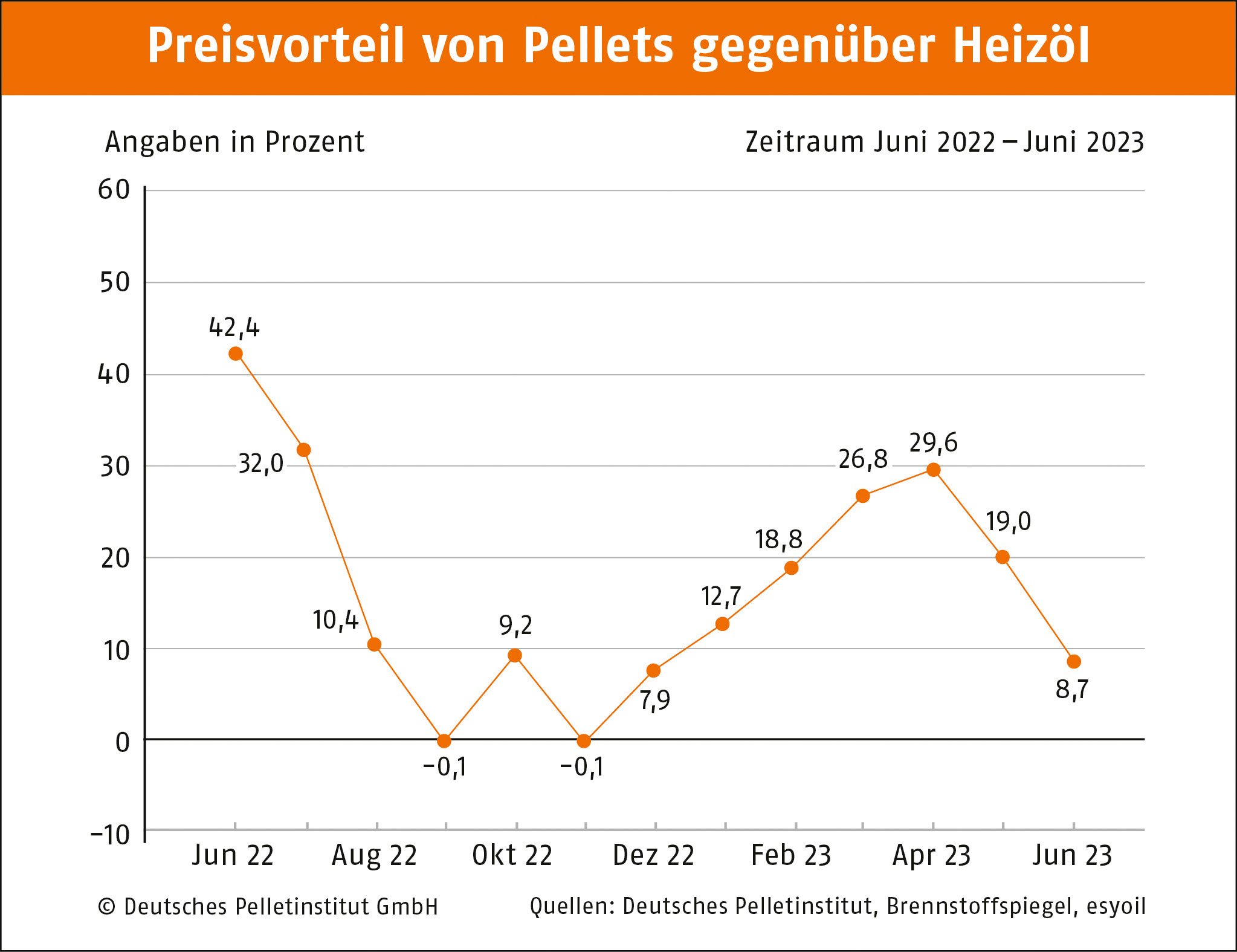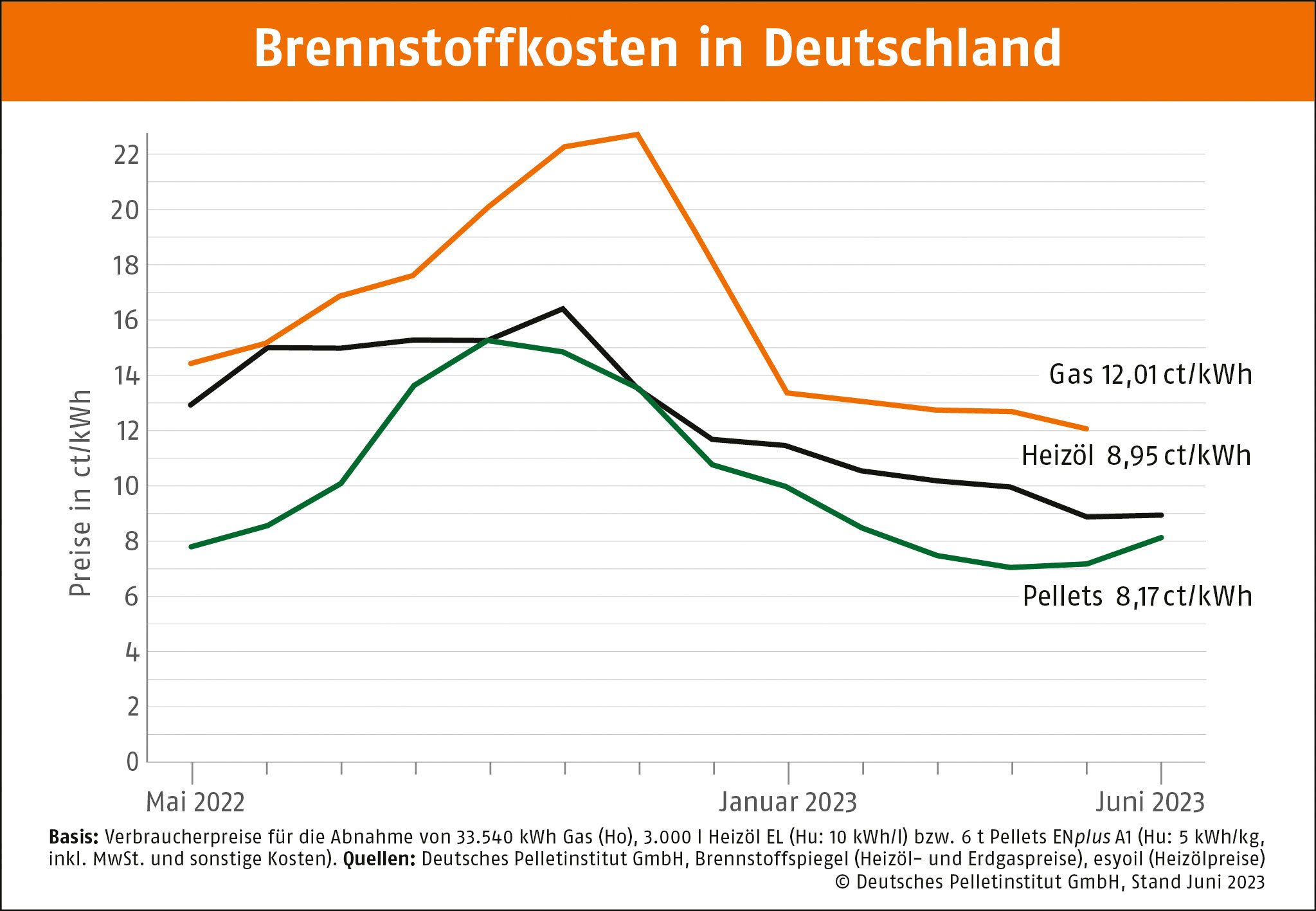 Berlin, 16.06.2023 • Der Preis für Holzpellets ist im Juni gestiegen. Eine Tonne (t) kostet nach Angaben des Deutschen Pelletinstituts (DEPI) durchschnittlich 408,41 Euro. Das sind 13,6 Prozent mehr als im Mai und 5,4 Prozent weniger als im Vorjahr. Damit verhält sich der Pelletpreis für die Jahreszeit untypisch. Eine Kilowattstunde Wärme aus Pellets ist für 8,17 ct zu haben. Zu Heizöl mit knapp 9 Prozent und zu Erdgas mit rd. 30 Prozent besteht weiterhin ein Preisvorteil.