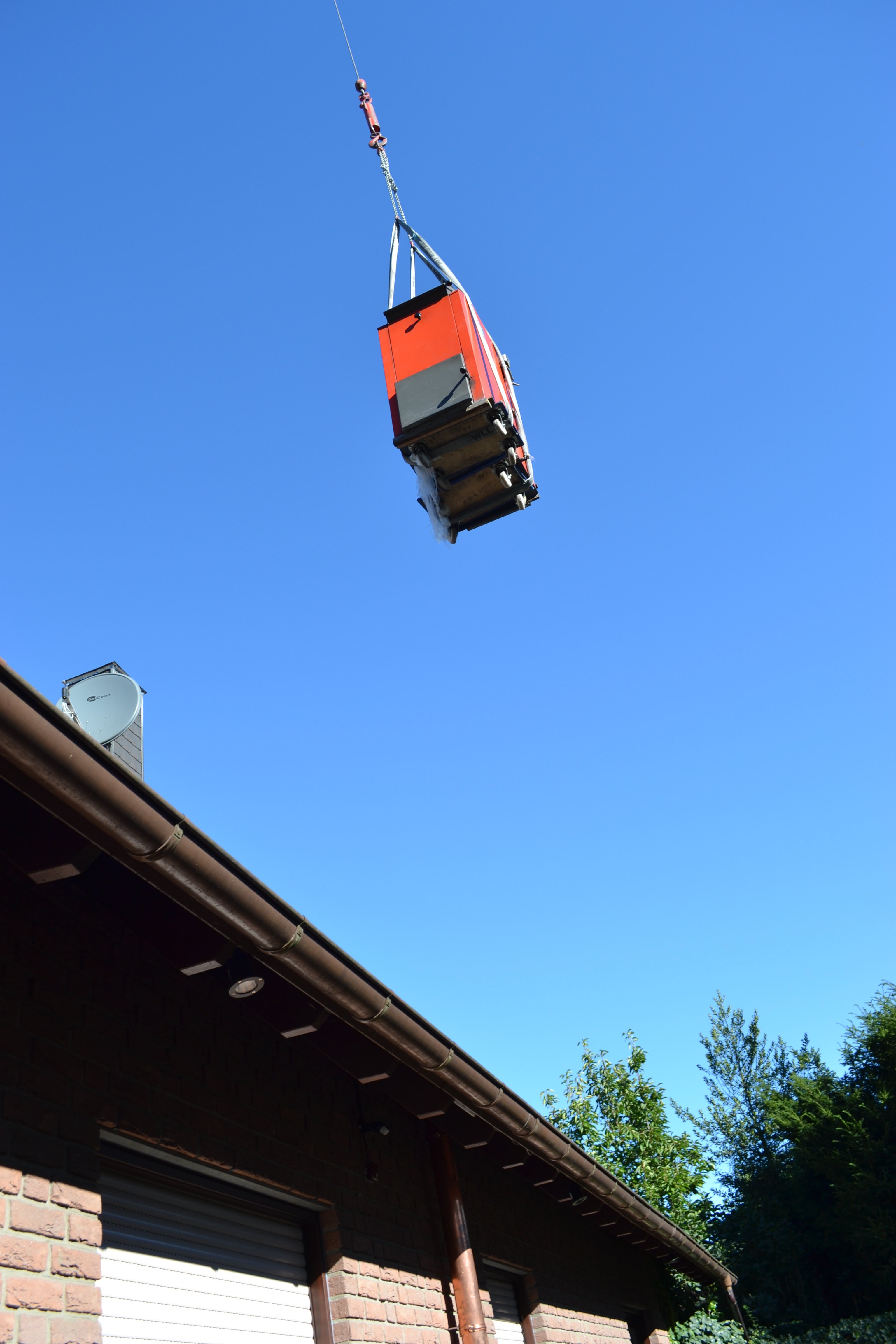 Kommt ein Kessel geflogen – der alte Kohlekessel ließ sich nur schwer montieren und musste 2016 per Kran über das Haus zur Straße gehoben werden. Den gleichen Weg nahmen dann der neue Pelletkessel und der moderne Pufferspeicher.