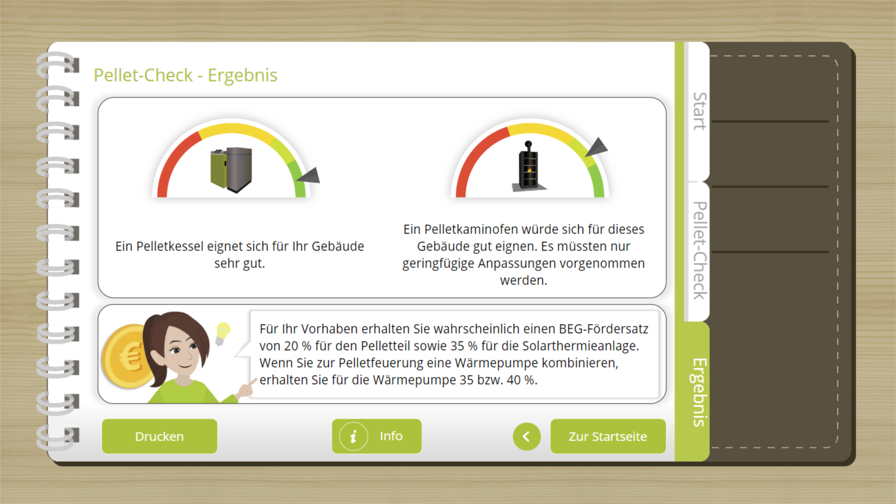 Das interaktiv gestaltete Lernmodul „Pelletfeuerungen in der Energieberatung“ bietet Energieberatern, Planern und Architekten einen kompakten Überblick über alles Relevante zum Heizen mit Pellets. Schwerpunkte sind Wirtschaftlichkeit, technische Rahmenbedingungen sowie häufige Fragen und Einwände im Kundenberatungsgespräch. Der dazugehörige „Pellet-Check“ ermöglicht es zudem direkt beim Kunden zu überprüfen, ob und mit welchem Aufwand eine Pelletheizung eingebaut werden kann.