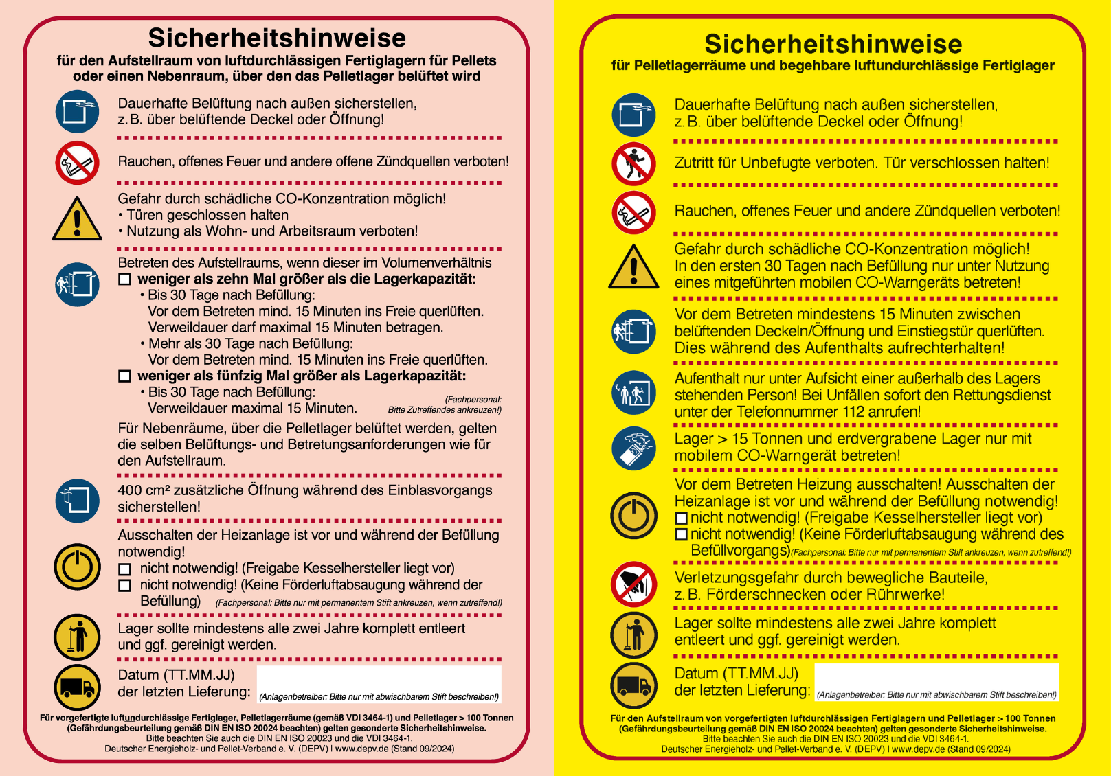 Es sollten Sicherheitshinweise am Zugang zum Lager angebracht sein. Die Sicherheitshinweise beinhalten Vorgaben zum Betreten des Lagers, wie dem gründlichen Lüften vorab und dem Beisein einer zweiten Person außerhalb des Lagers. In den ersten vier Wochen nach Anlieferung der Pellets sollte das Lager nicht betreten werden.